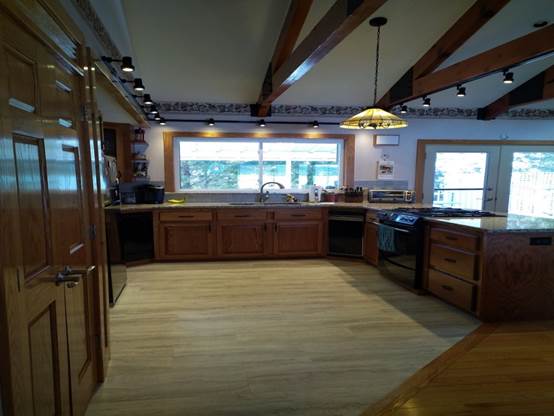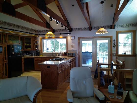 Kitchen from the entrance off the Covered South Deck. With the beam trusses above
