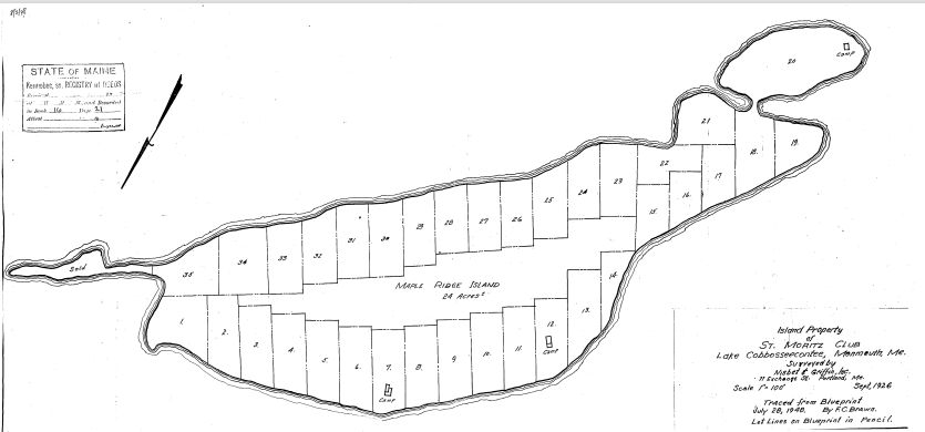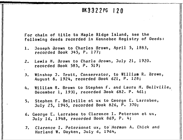 Maine Documents, Graphics, Resources Chain of Title to Maple Ridge Island 1964 Dayken – Chick Island Deed Monmouth Tax Map with Island Detail Kennebec County